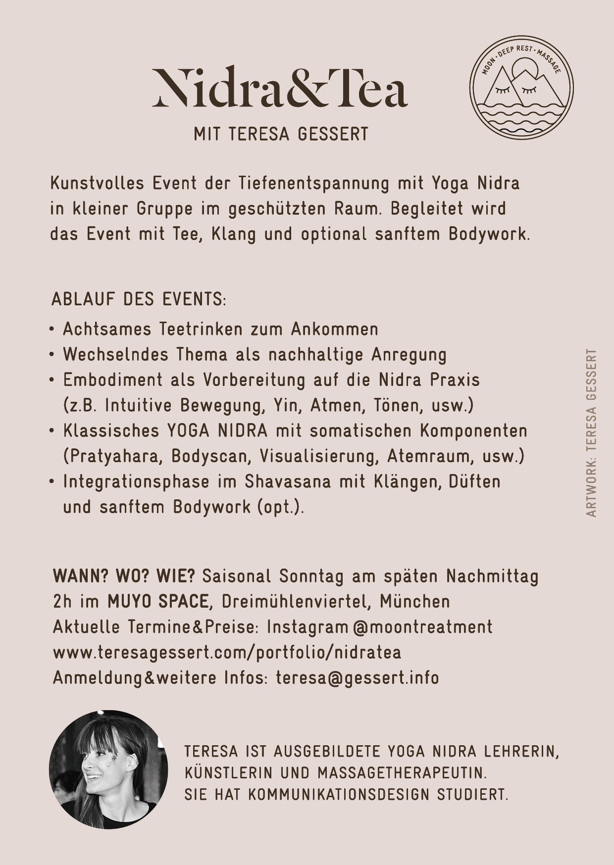 Teresa ist ausgebildete Yoga Nidra Lehrerin, Künstlerin und Massagetherapeutin. Sie hat Kommunikationsdesign studiert.
